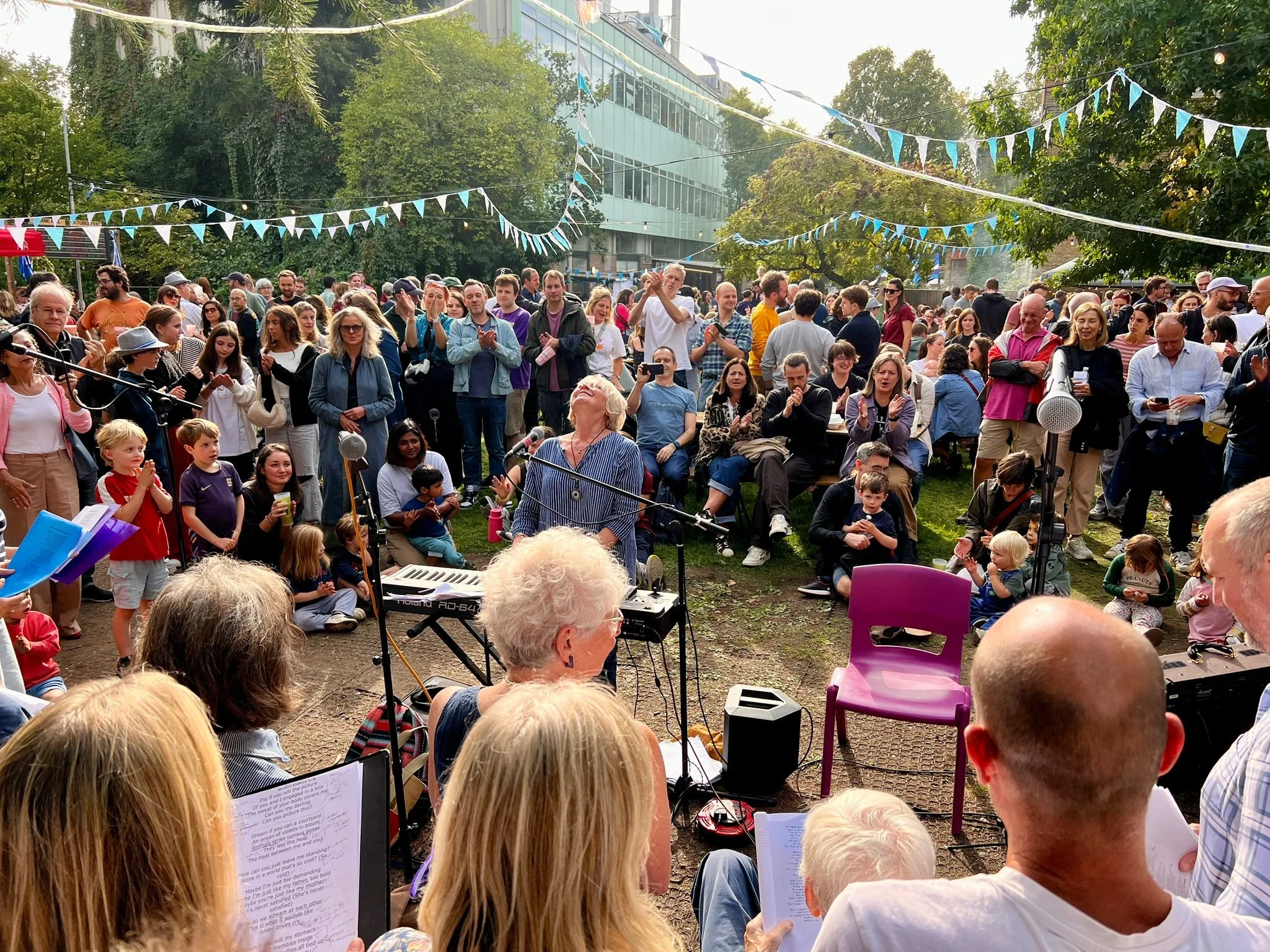 Braving venue changes when our beloved pub closed down, through Covid, Zoom, and singing outdoors, the incredible Sarah Fisher directs us with experienced keyboard skills.