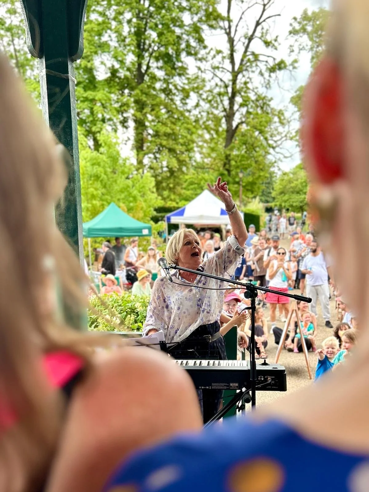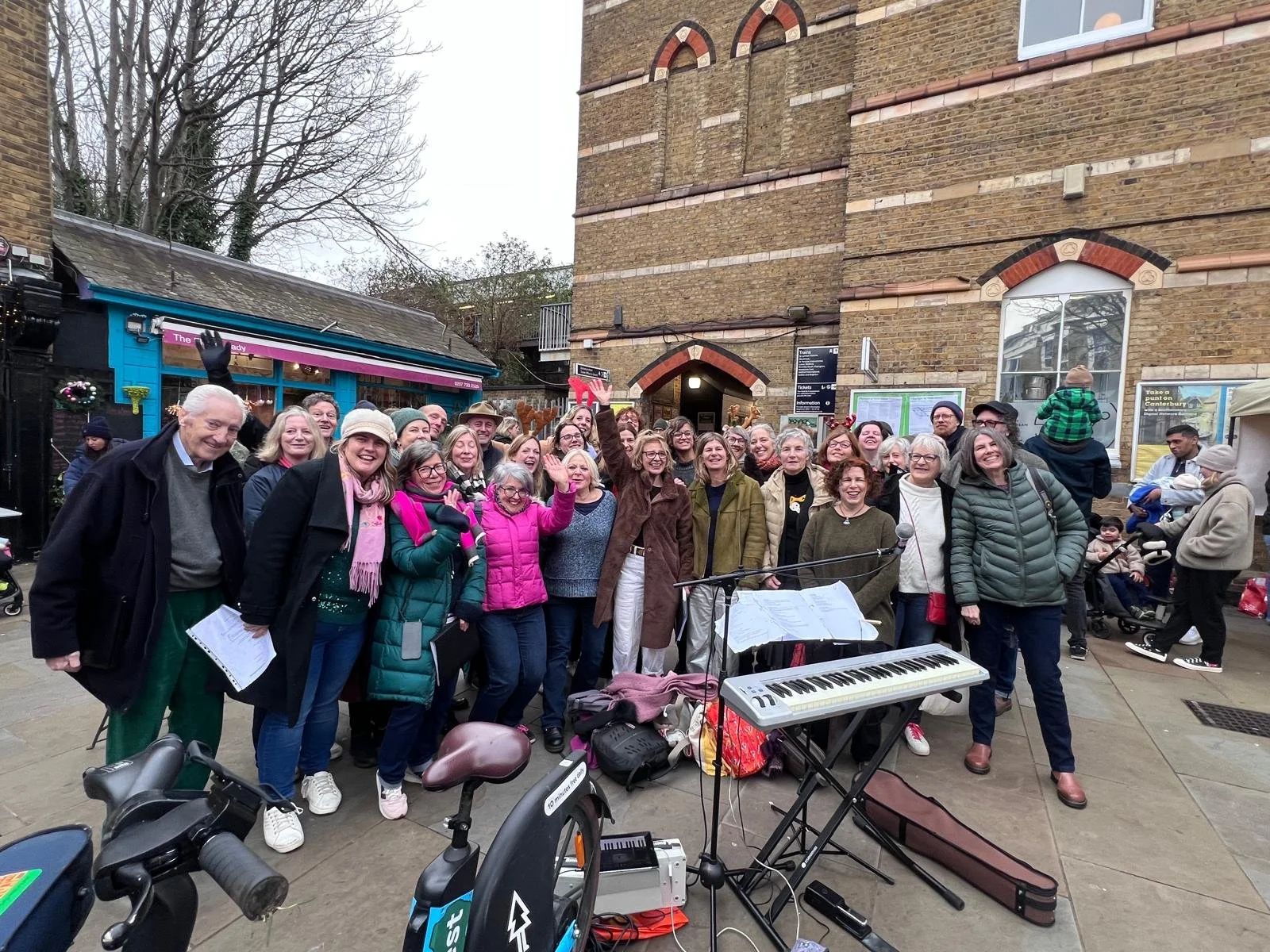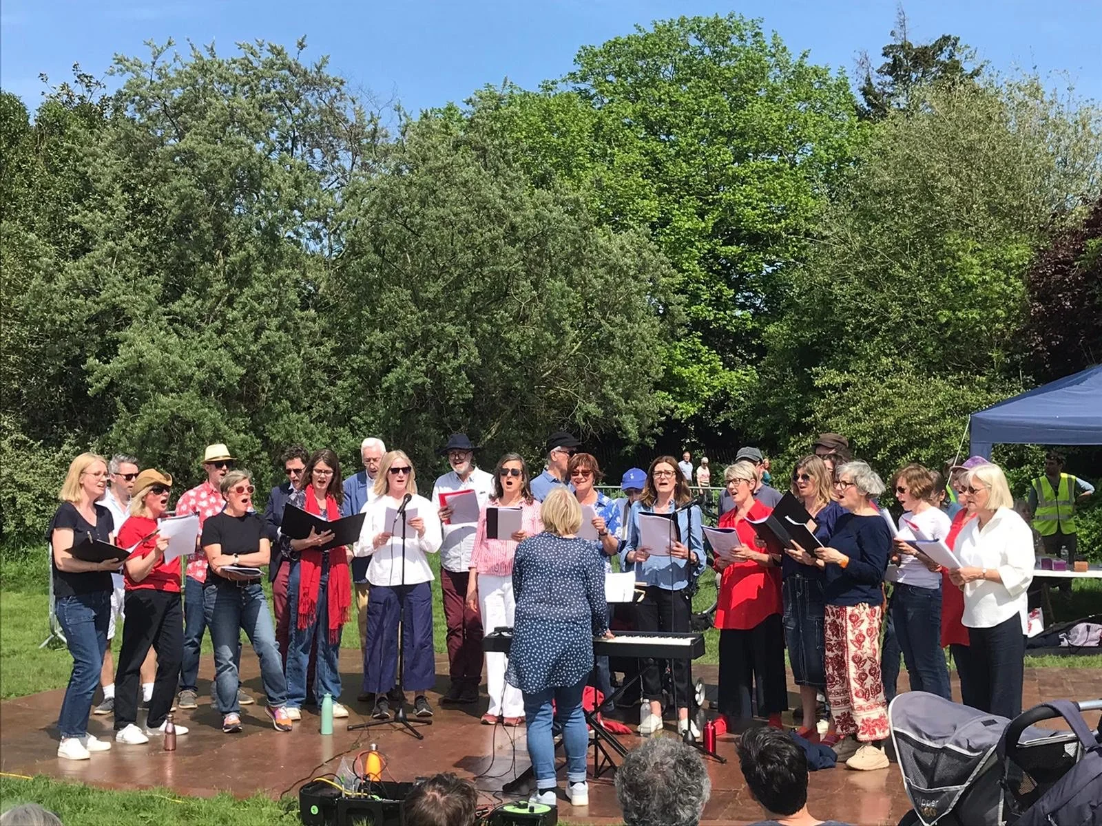 Braving venue changes when our beloved pub closed down, through Covid, Zoom, and singing outdoors, the incredible Sarah Fisher directs us with experienced keyboard skills.