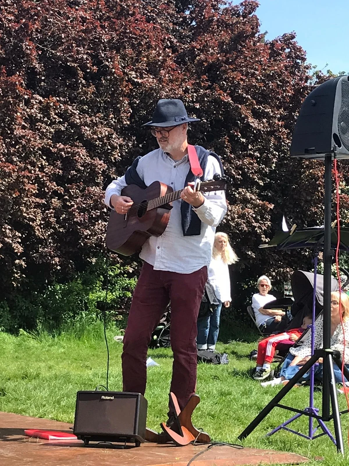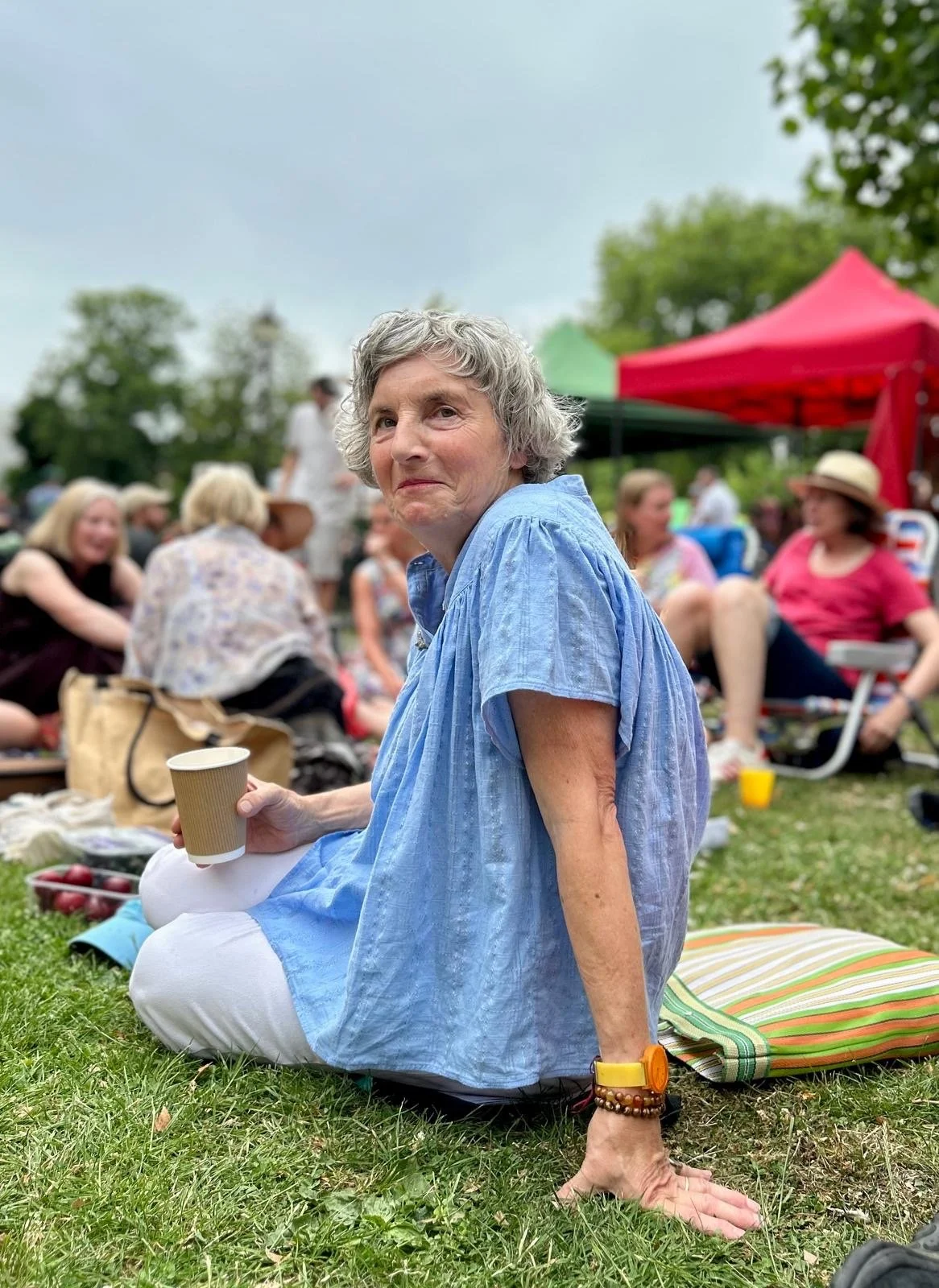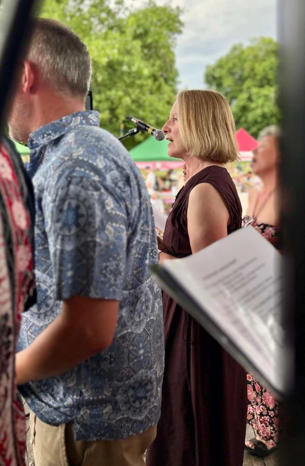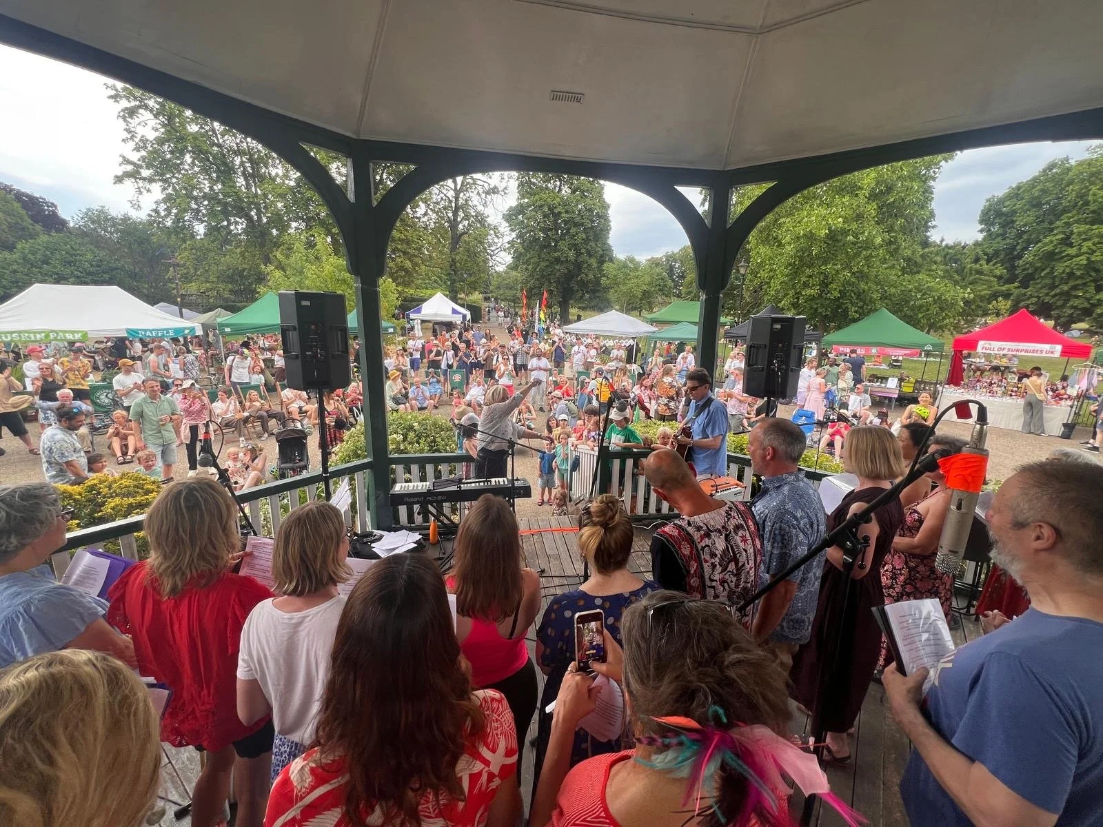 Braving venue changes when our beloved pub closed down, through Covid, Zoom, and singing outdoors, the incredible Sarah Fisher directs us with experienced keyboard skills.
